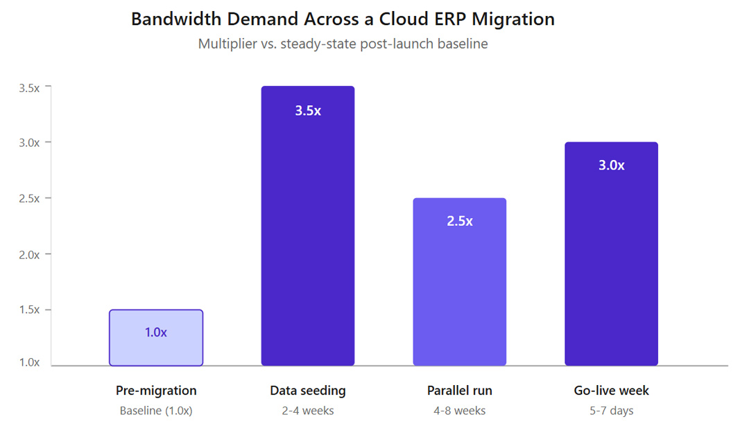 Initial data seeding. Moving historical data from the legacy system to the cloud ERP is a one-time, massive upload. Two to five years of transaction history, customer records, product catalogues, and financial data can run into hundreds of gigabytes. Seeding compresses into 2 to 4 weeks before cutover and pushes bandwidth to 3x or 3.5x the normal baseline.