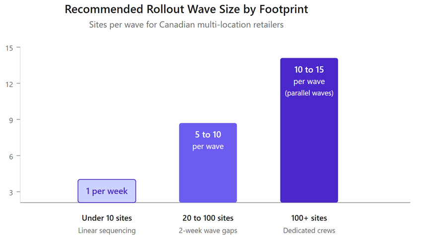 Wave sequencing should follow operational risk, not geography. The instinct is to group sites by province or region: all Ontario stores in wave one, all Quebec stores in wave two, all Western Canada in wave three. The better approach groups sites by operational complexity. All standard-format stores in wave two, all high-volume urban stores in wave four, all sites with legacy payment or inventory systems last. The geography gets handled inside each complexity tier.
